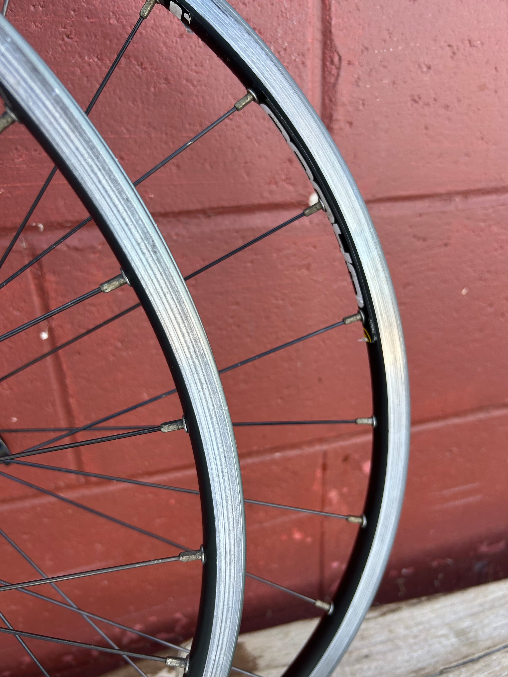 Used, scuffs and scratches from use. Logos are rear wheel are all damaged and peeling. Front wheel has some scratches on brake track but is smooth with lots of life left. Bearings are in good condition. Wheels are true.