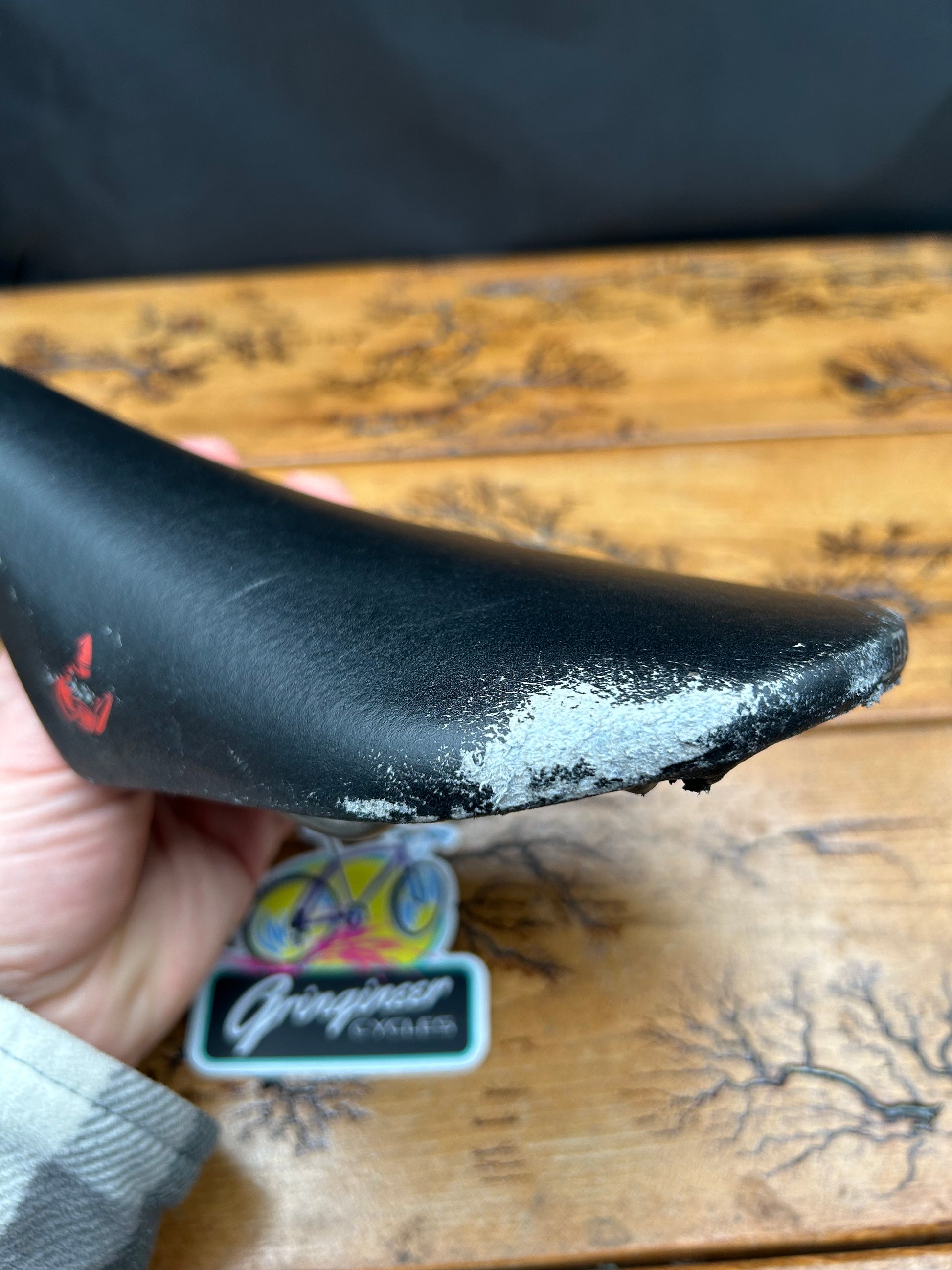 Used. wear and tears on rear and corners of saddle as shown in photos, material is loose from shell on rear corner as shown in photos.